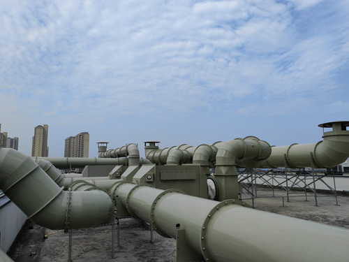 檢測實驗室室煙粉塵 → 靈活性炭吸附進行過濾系統 → 引制冷機 → 排放出